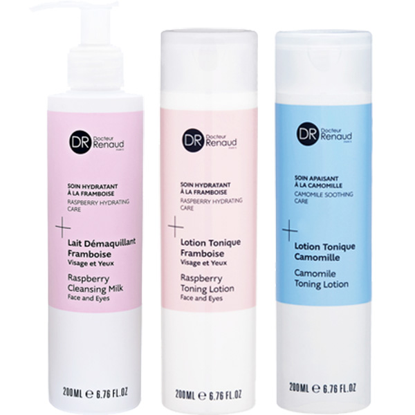 フランボワーズエキス配合で肌に潤いを与えるフランベリーシリーズと、敏感に傾きがちな肌をやさしくいたわるデマズレンのクレンジングと化粧水。